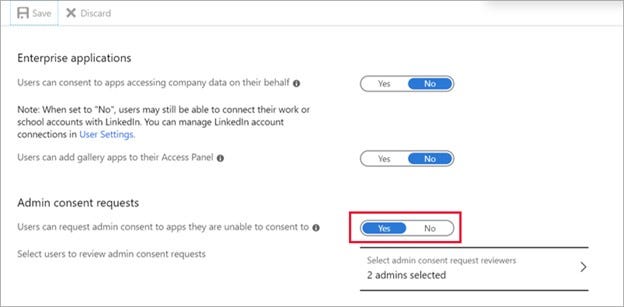 Under Manage, select User settings. Under Admin consent requests, make the following selections.